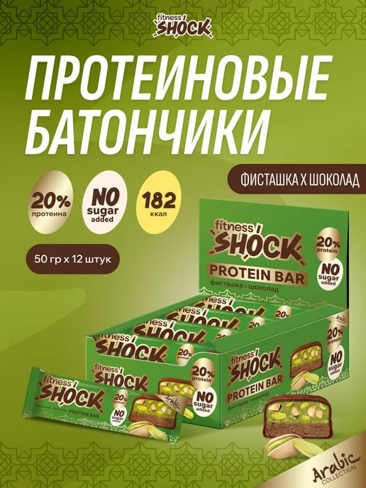 купить Кондитерские изделия Fitnesshock FitnesSHOCK Батончик глазир. "Фисташка-шоколад" 50гр. (шоу-бокс 12шт) в интернет магазине