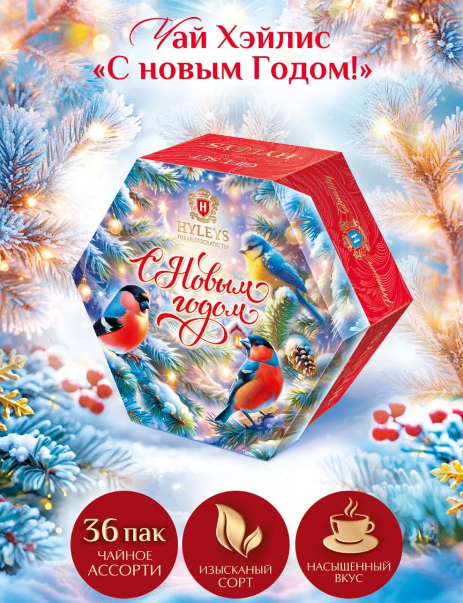купить Чай Hyleys "С Новым Годом"(Снегири), Ассорти ф/п 36*2гр. (черн.,черн. с ар. цитрус.,зел) (12) (13859) в интернет магазине