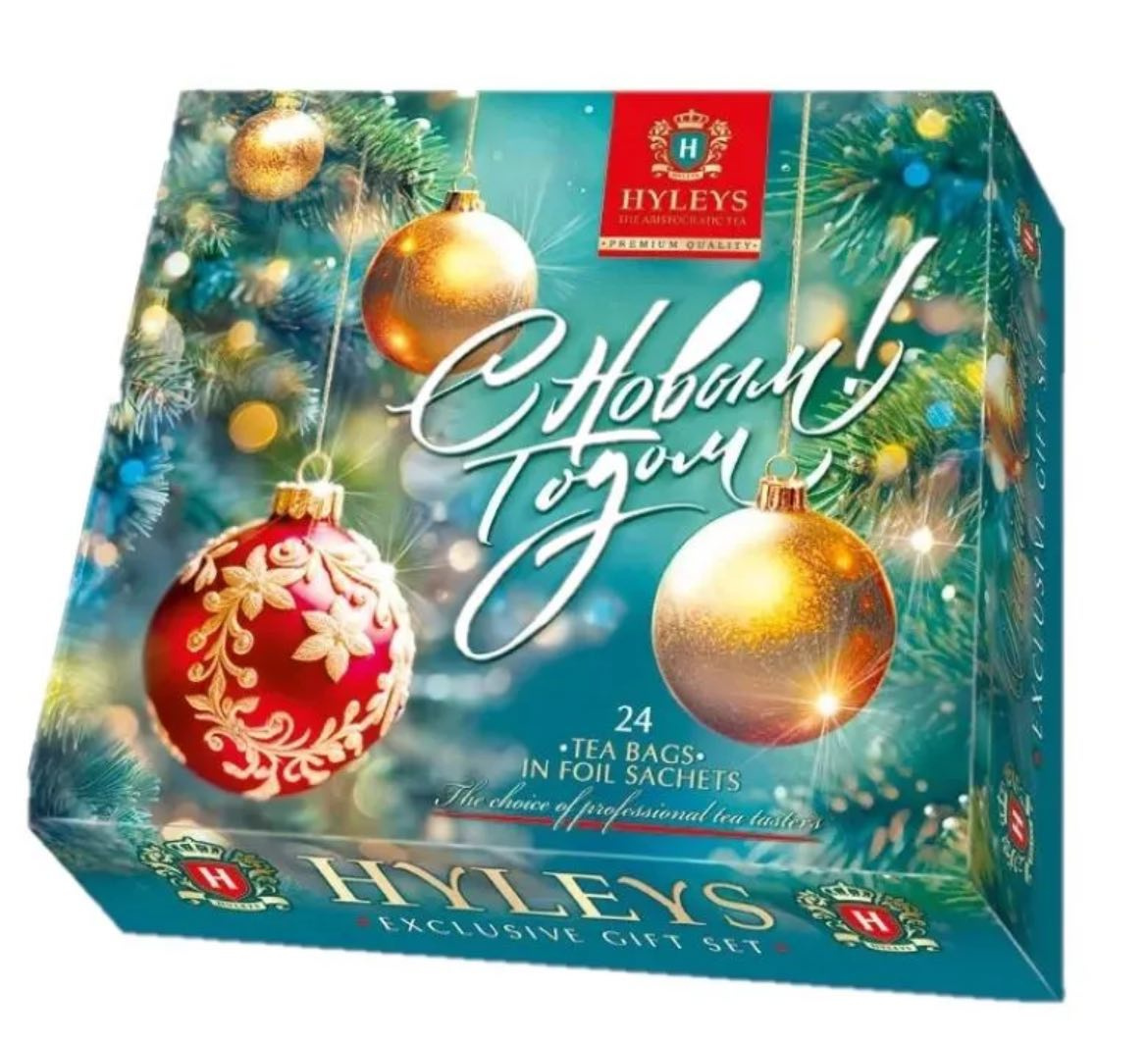 купить Чай Hyleys "С Новым Годом" Бирюзовый фон, Ассорти ф/п 24*2гр. (черн.,черн. с ар. цитрус.,зел) (12) (13361) в интернет магазине