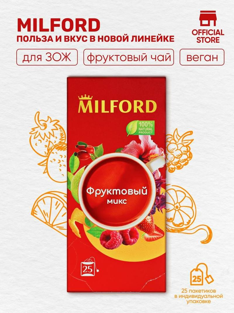 купить Чай Milford ЧАЙ MILFORD Напиток "Фруктовый микс"(шиповн.,ябл.,аром. клубн.и малины) 25пак.х 1,75 гр. (12) сашет в интернет магазине